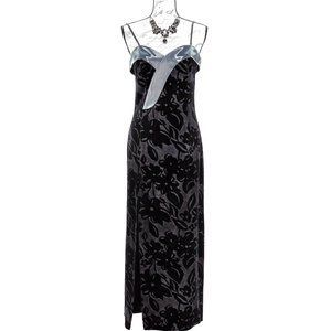 Black A-line style velvet long gown with spaghetti rhinestone straps. Silver V-neckline band panel through front and back of dress. Pre-owned, in excellent condition. Size 38.