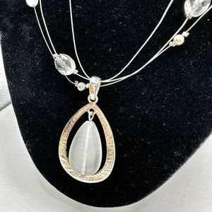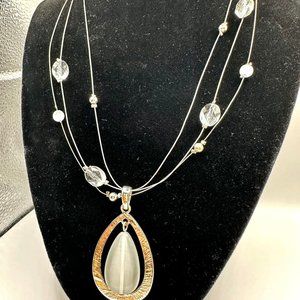 Pretty simple but elegant crystal and silver tiger eye shine pendant necklace with wire strings. Pendant is probably acrylic or glass of some kind. Great condition.