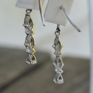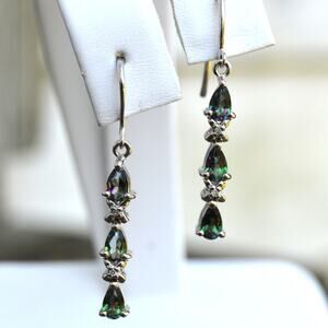 Lovely mystic topaz dangle earrings are solid 925 sterling silver. Each has 3 topaz stones and a small diamond chip for a combined total of 1.50cts Mystic Topaz and .001ct diamond.