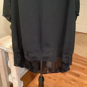#153 Gorgeous Chicos Black Lace Bottom Tunic W/ Necklace and Earrings Set SzMed. Gorgeous bishop sleeve, lace bottom top. Necklace has black faceted gems and gold waterfall earrings. All this. Pit to pit is 22”and 25” pit to bottom.