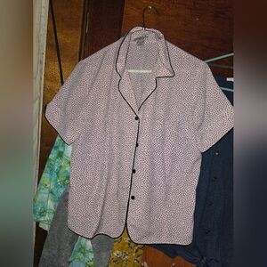 Short-sleeve top with black polka dots. Button-up front. Black trim on collar and sleeves.