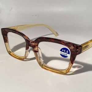 Brand new with tags +1.5 magnification strength Blue light filter lenses - great for screen time! Trendy translucent tortoise frame Square/rectangular shape - super flattering Lightweight and comfortable for extended wear Perfect for reading, computer work, crafting Stylish enough to wear as a fashion accessory These aren't your typical boring reading glasses! The fun tortoise color and modern square shape make them a stylish addition to your daily routine. Whether you're working from home or curled up with a good book, you'll look cute and feel comfortable.
