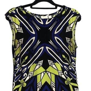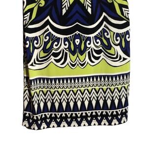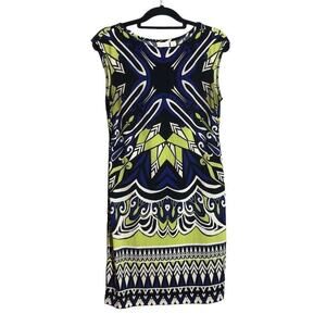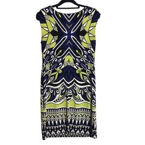 Sleeveless Boatneck Shift, Stretch Fabric, Comfortable Fit, Geometric Kaleidoscope Print in Blue and Green, Knee Length, Summer Dress, Best for Work, Casualwear, Like New