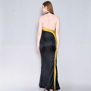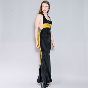 Rare couture runway Atelier Versace vintage gown. Solid black color and yellow mesh contrast with gold beads. Halter neck, invisible side zipper. Fits like size XSmall. (0-2). Waist appx 24".