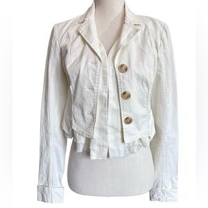 Get an instantly layered look with this unique twofer jacket, featuring a cropped, cotton-linen outer layer with a breezy, blousey inner layer for an effortlessly chic look. Cropped, breezy, Stretchy cotton linen outer layer, blazer style, button detailing, breezy cotton inner layer with hook-and-eye closure, raw hem, This double-layer design makes for a unique addition to your jacket collection.