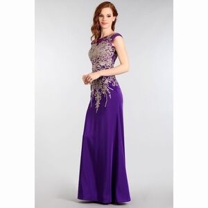 Beautiful sleeveless dress with a Polyester skirt and jeweled rhinestone lace beaded top. Side zipper. This dress runs small and is form fitting. Please refer to size chart.