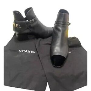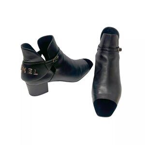 $1575 Chanel 21A Black Leather Velvet Toe Cap Logo Gold Strap Ankle Boot 10.5/41