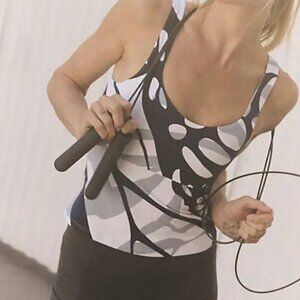 Work up a sweat in this hip-length, perfectly printed tank, featuring super soft, sweat-wicking fabrication and breathable strappy back. Fitted; tank top silhouette; bottom seam hits right at hip; scoop neckline, Sweat-wicking finish; super soft fabrication; built-in bra shelf; strappy open back. This top is super flattering while offering full-length coverage.