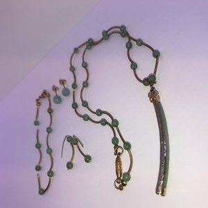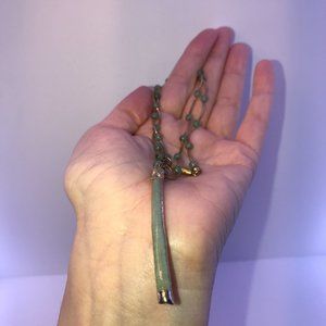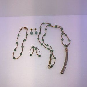 16 1/2" necklace features 4 mm round jade beads and a jade dangle piece in the middle. There are gold stone beads and gold tone curved pieces and a twist closure.