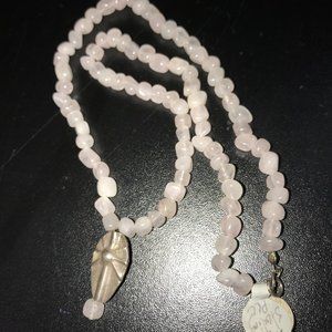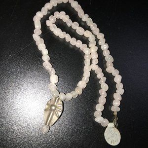 16 1/2" small pebble rose quarts beaded necklace features sterling silver findings and a 4 mm sterling silver spring closure clasp. The small pebbles of rose quarts range in size from 5 to 6mm in diameter.
