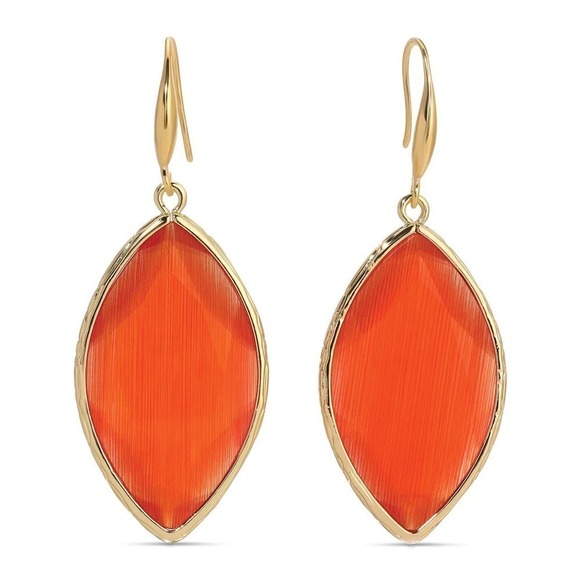 Exquisite gold-bordered earrings feature an almond-shaped cat's eye stone that dangles gracefully. Detailed craftsmanship meets opulent design in this must-have colorful accessory.