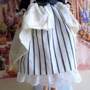 This is a charming ensemble for your 16" Tonner dolls such as Tyler Wentworth, Sydney Chase. My Brenda Starr doll is modeling it, and looks beautiful in it. (She is not for sale here.) You will receive the items she is wearing: a lacy cap, navy blue velveteen jacket with white fischu, a striped skirt with overskirt attached, a lace-edged petticoat, and pantalettes. Turn your doll into a country maiden in this rare outfit.