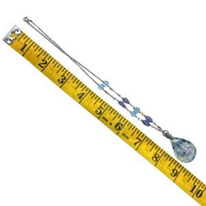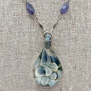 Lovely handblown glass pendant in modern floral flourishing design hangs from a sterling silver chain with alternating lavender and pale blue crystal gemstones. A beautiful conversation starter, artistically designed in gorgeous cool tones that with will work both with jeans or any elegant ensemble. 16" Chain with approximately 1.5" pendant drop. Gentle tarnish on the silver, previously loved with no flaws. Color in photo is close but not exact, elegant in pale blue and amethyst tones.