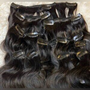 Brand new Clip in 10 Pieces 100% Human Virgin hair Color: 1B + 99j 100 grms Great Quality Double weft sewed. Lenght:16 In 100% Human hair