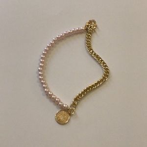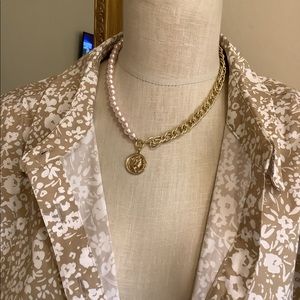 Very pretty and has a different look depending on what you wear. Half gold chain and half pearls with gold coin in the middle. Better fashion jewelry.