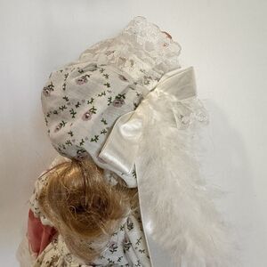 16" Porcelain Doll Blonde Hair Blue Eyes Period Dress with Hat & Bag Collectible