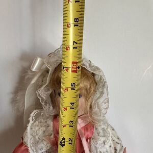 This elegant 16-inch porcelain doll features stunning blonde hair, bright blue eyes, and is dressed in a beautiful period costume complete with a stylish hat and matching bag. The intricate details and timeless appeal make this doll a perfect addition to any collection or a thoughtful gift for any doll enthusiast.