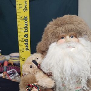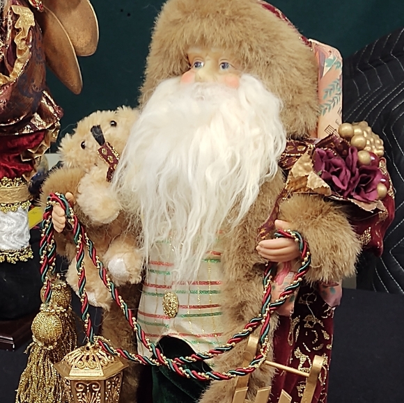 16" tall, hand painted face and hands, faux fur coat with beautiful velvet and gold roses. His arms can be moved in different positions... Secured to a round pedistal.