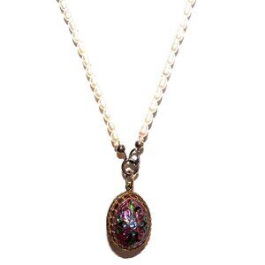 A conversation piece of a Russian Egg, embedded with crystal stones in sky blue, the exact same design is on both sides of the pendant! The filling is purple and green enamels, suspending on a beautiful 16" fresh water pearl chain, clasping at the very front with a lobster claw clasp. The egg measures just short of 7/8" long.