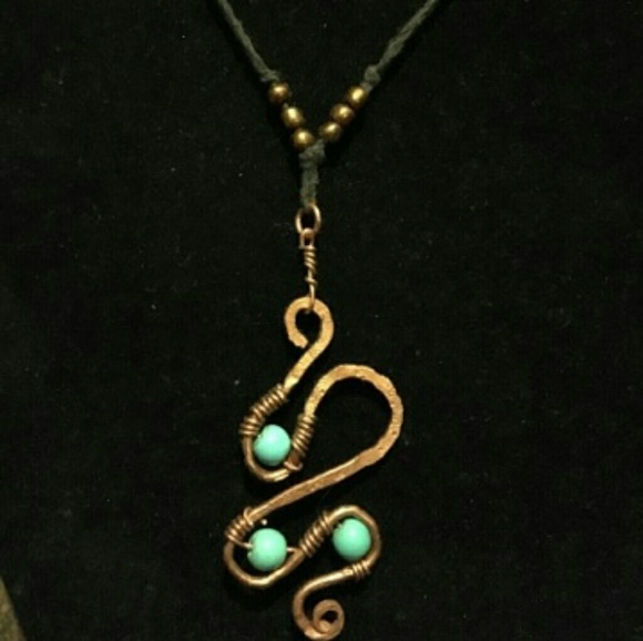 One of a kind hammered 2" inch copper pendant embellished with wire wrapping and turquoise beading.