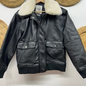 $160 Abercrombie Black Faux Fur Collared Vegan Leather Bomber Jacket Coat Small