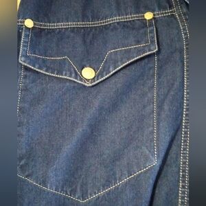 Vintage blue denim button down shirt with iconic Versace label, medusa head gold-colored buttons, and metallic gold top stitching. In great vintage condition. The fabric content tag was already cut off when I got it but feels like cotton or a cotton blend. It has two button flap chest pockets. It's oversized, so a little big on me or I'd keep it. The perfect denim statement piece. PTP is 23". Center back length is 31". Shoulder seam to end of sleeve cuff is 23".