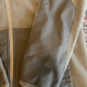 It's a heavy duty fleece with reinforced arms and elbows. The interior pockets are 8 inches deep and have velcro tabs.