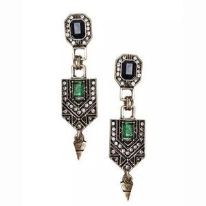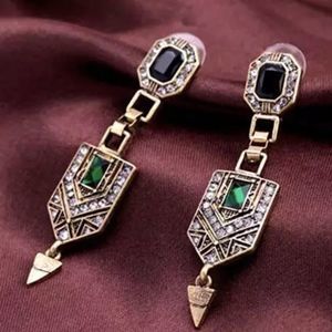 💎163💎 Art Deco Inspired Geometric Emerald Green Crystal Goldtone Earrings