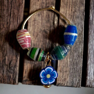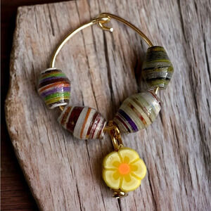 Really cute set of 6 wine glass charms made with recycled paper beads and cute little rubber charms.