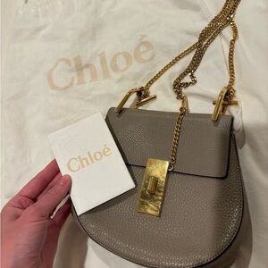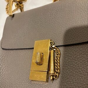 This is an authentic CHLOE Grained Lambskin Mini Drew Shoulder Bag in Motty Grey. This chic crossbody is crafted of finely grained lambskin leather. The bag has a bijoux long polished gold chain shoulder strap and a facing flap with a polished gold turn lock and pin closure. The flap opens to a beige suede interior with a hanging pocket.