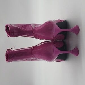 Bold and stylish, these hot pink vegan leather boots will turn heads. Designed with a sleek silhouette, pointed toe, and a unique flared stiletto heel for a confident statement. Perfect for fashion-forward outfits, parties, or adding a bold pop to any look.