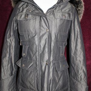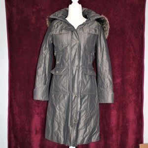 Laundry by Shelli Segal gun metal gray polyester blend detachable hooded coat, beautiful tipped fox fur trim on faux fur linded hood, zipper and snap closure,2 pockets, 4 snap closure pockets, 1 pocket inside, quilted lining, size tag states small. Measurements are arm pit to pit 20", shoulders 17", sleeves 23" and length 38".