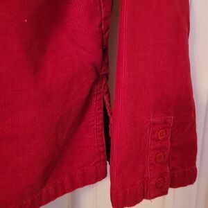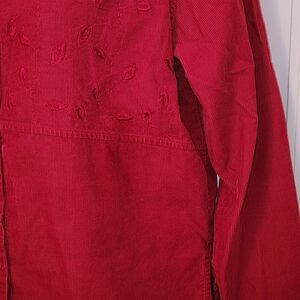 soft corduroy red (not a true red) barn door red. long sleeve, with embroidered leaves on the front of it, 3 buttons on sleeves ,side slits. EUC Size: large