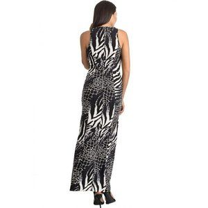Sleeveless "Olivia" maxi shift dress in black and white "In the wild" print with v-neckline and two front mid-thigh length slits.