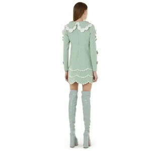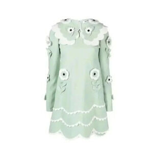 This beautiful dress from Vivetta is perfect for any party or cocktail event. The dress features a stunning floral pattern in a mint green color, with embroidered accents that add a touch of elegance. The dress is a size 40, with a knee-length hemline and a round neckline.