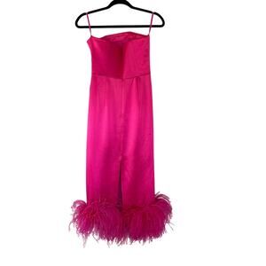Absolutely stunning 16Arlington Himawari dress, a true statement piece! This strapless midi dress features a chic knot detail and a playful feather trim, all in a beautiful pink satin fabric. Perfect for special occasions or a night out.
