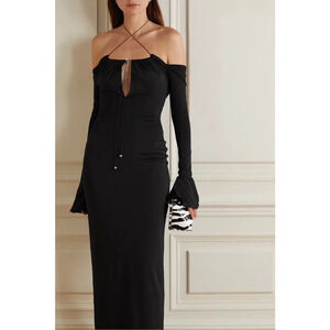 16Arlington Salm Off The Shoulder Midi Dress in Black. Size 10. Features crisscross halter neckline with cut-out, long sleeves with flared cuffs, off-the-shoulder, back slit, and maxi length. Style D-194-AW22-BLK. 94% Polyester, 6% Spandex. NWT / New with tags.