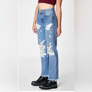 A rock and roll edgy vibe. Distressed with raw hem. Waist 15”, rise 12”, inseam 29”. Questions? Leave a comment below!