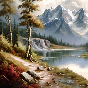 Majestic Spring Snowy Landscape Oil Painting Art Print Gorgeous Scene with Trees, A Pond, Mountains, and Birds Flying in the Sky Beautiful Oil Painting Art Print