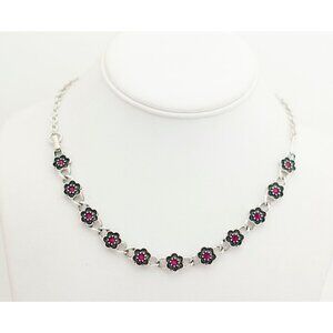 17 Inch silver and black tone flower necklace with pink rhinestones. Made by Avon.