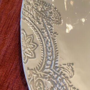 Gorgeous embossed stoneware platter from Pottery Barn’s discontinued Scarlett line. The detailing on this piece is so pretty — a raised paisley-inspired border that instantly elevates any table setting. Perfect for holidays, hosting, or collectors trying to complete their set.