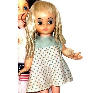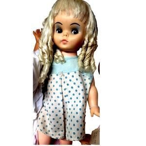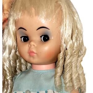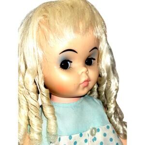 This vintage 17-inch doll is a unique find! With her striking blue eye shadow and big eyes, she's sure to stand out in any collection. A rare and unusual piece from yesteryear! I think you'll love her.