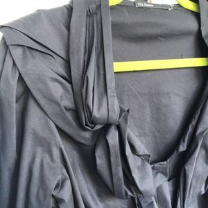 Is cotton, nylon, spandex top can be worn dressed up or dressed down. Very comfortable. Check out the pictures
