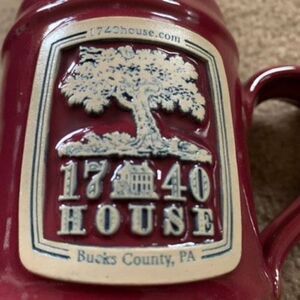 1740 House Bucks County Pennsylvania Clay Ceramic Cup Mug. Color is more of a burgundy. 3 3/4” tall. No chips or cracks.