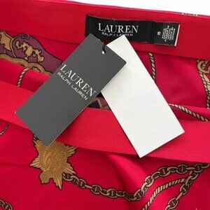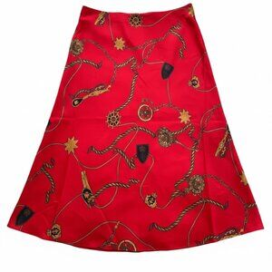 STUNNING RED A-LINE / BIAS-CUT SKIRT BY LAUREN RALPH LAUREN. FEATURES A LUXURIOUS SILK-BLEND DRAPE WITH A CLASSIC NAUTICAL PRINT OF GOLD CHAINS, ROPES, SHIP WHEELS, STARS, AND CRESTS. LENGTH FALLS BETWEEN KNEE AND MIDI, DEPENDING ON HEIGHT.
