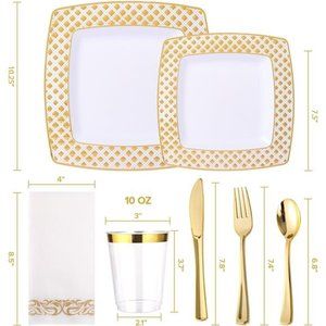 175 Piece Gold Dinnerware Set 25 Guest-50 Diamond Square Plastic Plates