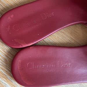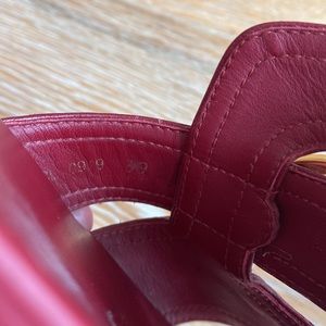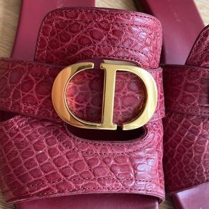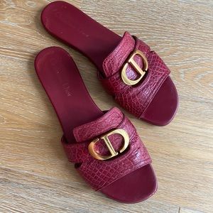These are extremely rare in this color and the alligator leather. I think it is alligator but I’m not sure. Great condition, the uppers/straps look almost perfect. There are minor scuffs on footbed and toe area as shown in photos. Color is kind of a red burgundy wine with slight pink tone. Gold CD logo hardware.