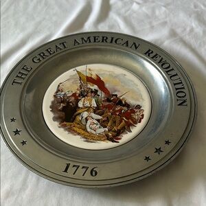 Commemorative plate featuring a historical American Revolution scene. Silver border with vibrant colors.