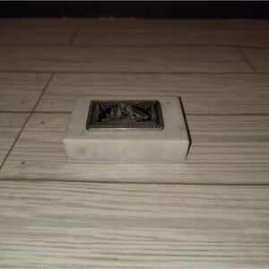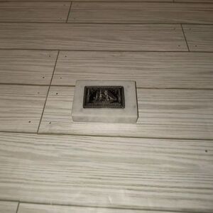 1797 US Frigate Constitution Pewter Stamp 1947 Italian Marble Paperweight 3x2in. Has some wear from age and storage. Sold as is.