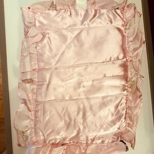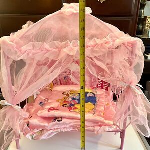Bed is in great condition. Only missing one of the tie backs for the canopy. Please see photos. The top back is a light pink ribbon that you could probably find out any craft store.